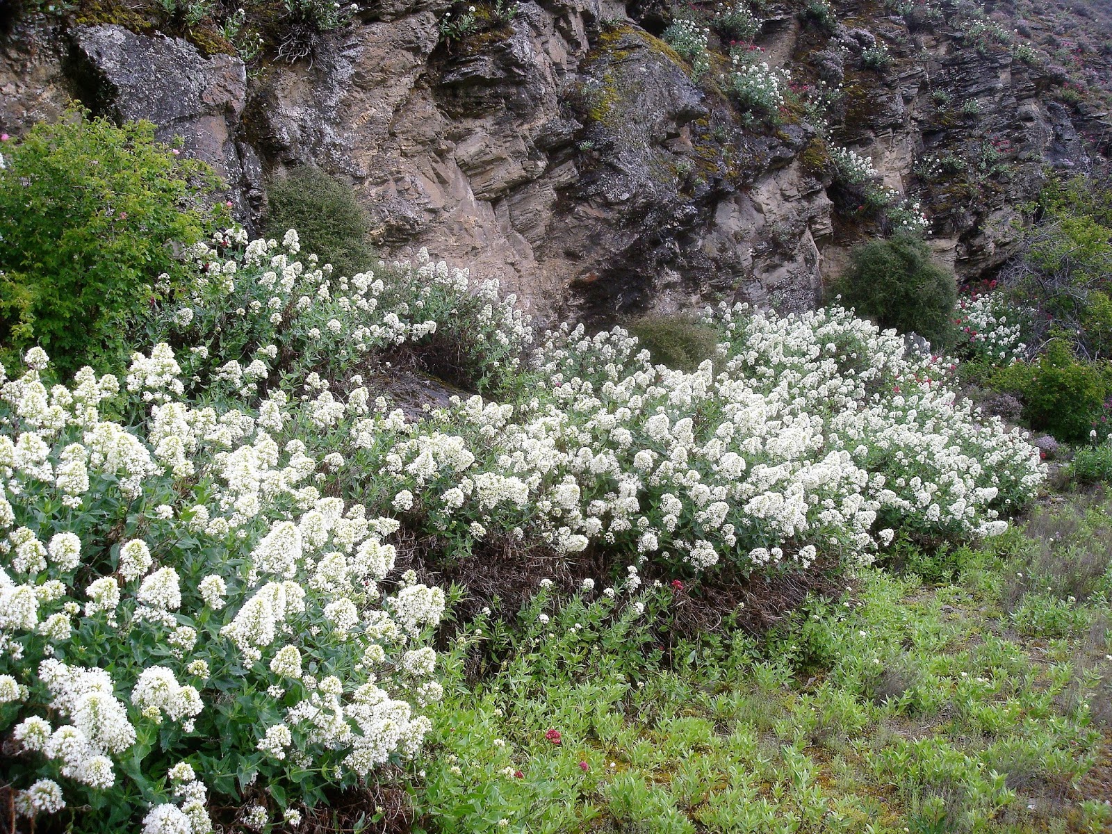 Of course, its mostly red valerian (a.k.a. Jupiter's beard: Centranthus ruber) which has naturalized many places on the planet. I have admired this blooming wild in Greece, where it seems to almost always be a chalky pink: here every shade from pure white to deep crimson can be found. Along with California poppies (Eschscholtzia californica) and a goodly number of other Mediterranean introductions. All of them exotics and all of them planted with such cunning and care you'd swear it was a garden.