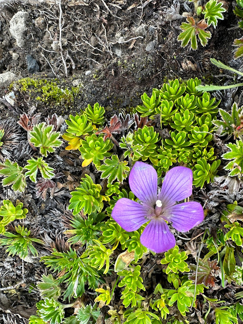 At first I took it for a crocus: it kept appearing again and again around the lake at the foot of Cotopaxi around 12,000' pin elevation. Here it can get chilly--even freeze--most any night of the year. But every day warms up a tad. We saw it again at other spots--it's not rare here. But it is apparently restricted to Paramo in Colombia an Ecuador.